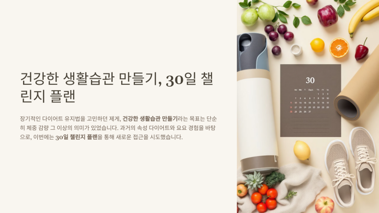 장기적인 다이어트 유지법을 고민하던 제게, 건강한 생활습관 만들기라는 목표는 단순히 체중 감량 그 이상의 의미가 있었습니다. 과거에는 속성 다이어트를 반복하며 요요를 자주 겪었지만, 결국 몸도 마음도 지치기만 하더라고요. 그래서 이번에는 체중 감량과 건강 관리를 동시에 잡을 수 있는 새로운 시도를 해보기로 했습니다. 그 결과물이 바로 30일 챌린지 플랜이었는데요. 오늘은 제가 직접 실천해 보며 느낀 점들과 함께, 어떻게 장기적인 다이어트 유지법으로 발전시킬 수 있었는지 공유해 보겠습니다.