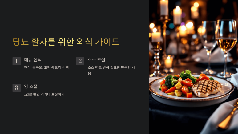 당뇨병 환자에게 외식은 부담이 될 수 있지만, 올바른 선택을 하면 충분히 건강하게 식사를 즐길 수 있습니다. 중요한 것은 혈당을 급격히 올리는 음식을 피하고, 균형 잡힌 식사를 하는 것입니다.
