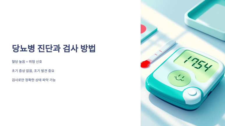 당뇨병은 초기에는 특별한 증상이 없기 때문에 정확한 검사를 통해 본인의 혈당 상태를 아는 것이 중요합니다. 공복 혈당 검사, 경구 포도당 부하 검사, 당화혈색소 검사를 통해 당뇨 여부를 확인하고, 정상 수치와 비교하여 자신의 상태를 점검하는 것이 필요합니다. 또한 가정에서도 혈당을 꾸준히 측정하면 혈당 변화를 즉각적으로 파악하고 조절할 수 있어 효과적인 관리가 가능합니다. 혹시 최근 건강검진에서 혈당이 정상 범위를 벗어났다면, 이를 가볍게 넘기지 말고 생활 습관을 점검하고 당뇨병 예방을 위한 실천을 시작해 보는 것은 어떨까요? 😊